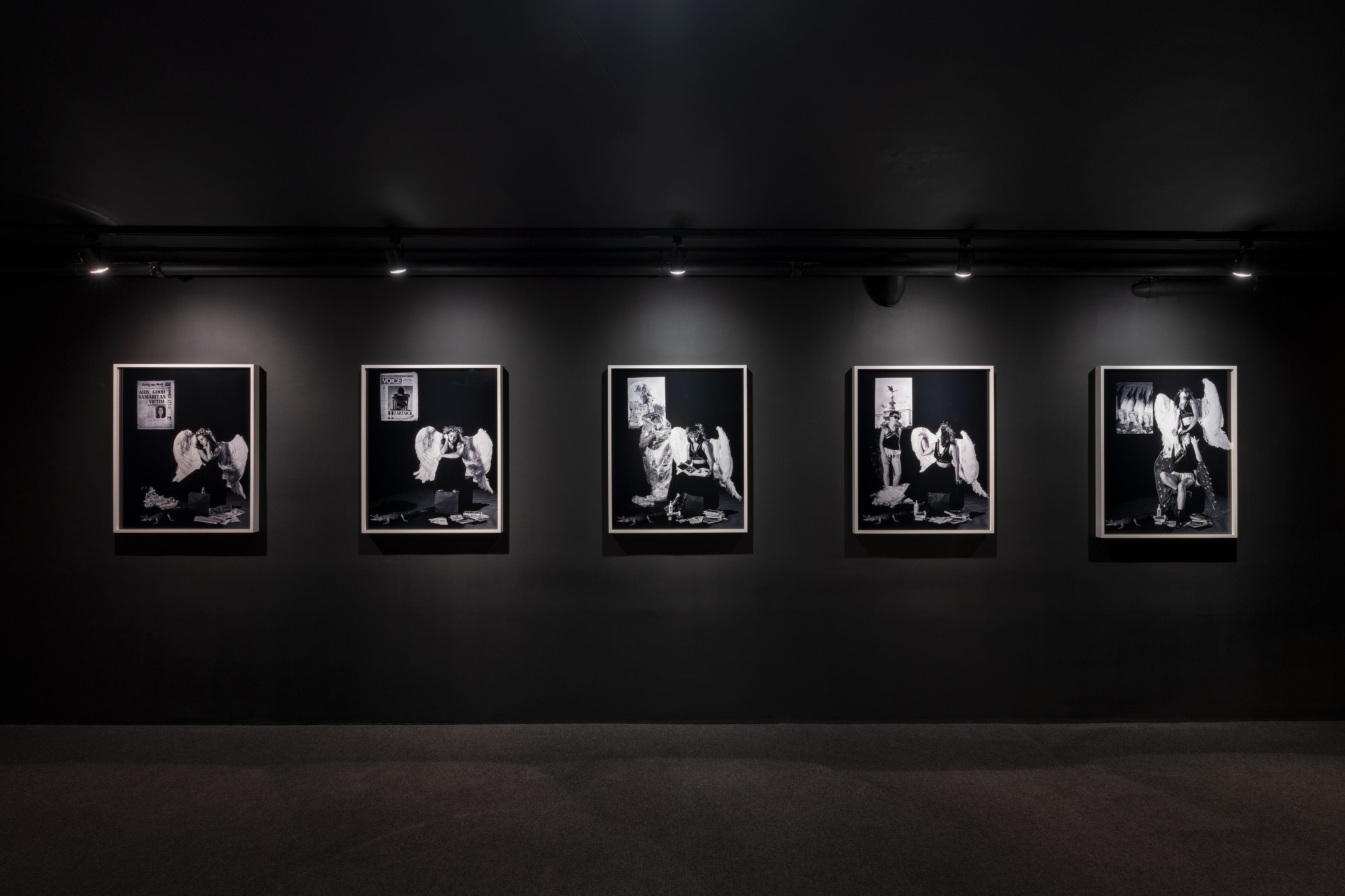 Tessa’s opening photograph recreates this composition with a leather-clad angel sitting in darkness, but the source of her melancholy is made explicitly contemporary and political, she’s surrounded by newspaper headlines about AIDS that exemplify the mainstream media’s sensationalist and often homophobic coverage. The angel has access to publications like the Daily Mail, which ran fear-mongering stories, and the Village Voice, which featured Peter Hujar’s photograph of David Wojnarowicz but still failed to address lesbian experiences of the epidemic. At the angel’s feet, however, are materials from gay and lesbian activist presses that provide more accurate, community-generated information about HIV transmission and safer sex practices. This setup establishes the series’ critique of how information circulates differently through mainstream versus community-based media, and how access to the right information can be transformative.